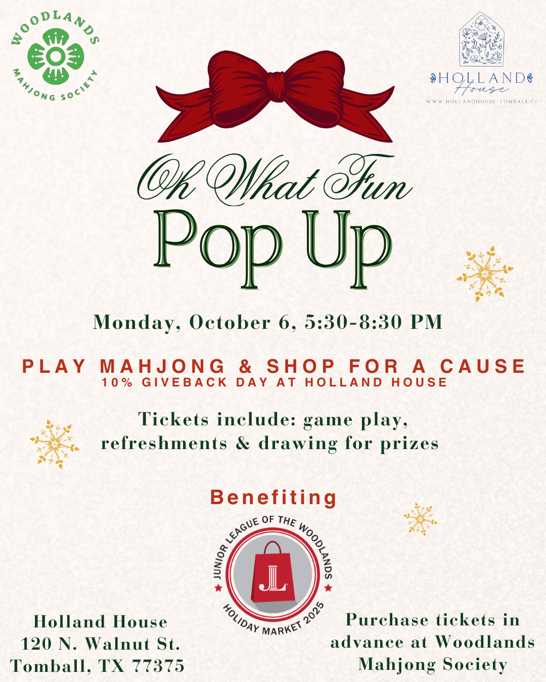 Join us for an exciting evening of Mahjong and giving back! This evening will benefit Junior League of The Woodlands and the many programs that they offer.